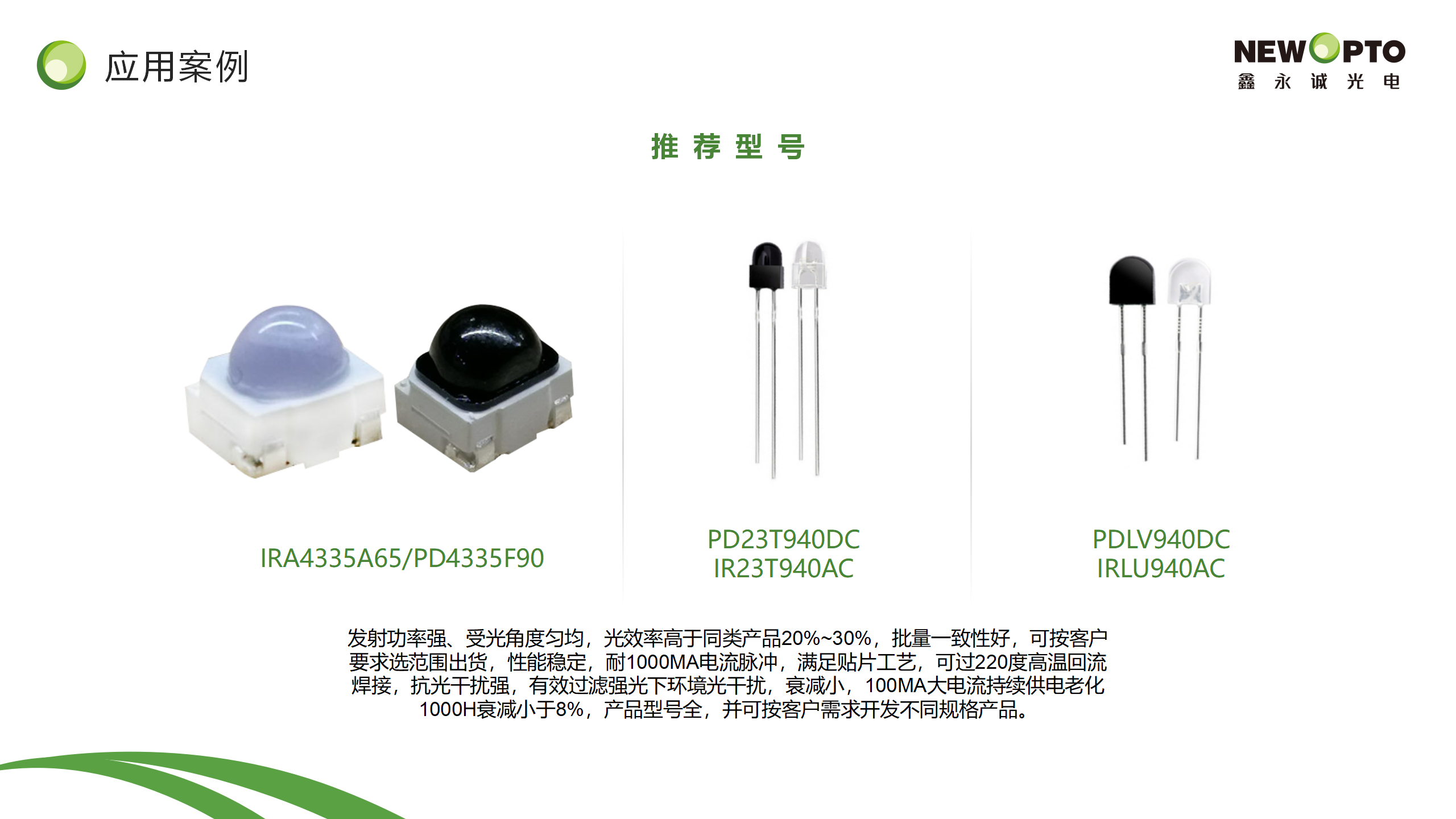 Strong transmitting power, uniform receiving angle and light sharing efficiency are 20% - 30% higher than that of similar products; good batch consistency can be selected according to the customer's requirements; stable performance and resistance to 1000mA current pulse; high temperature reflow process welding can be achieved to meet the mounting process; strong anti light interference and effective filtering of environmental light interference under strong light; small attenuation 100mA high current continuous power supply aging 1000h attenuation is less than 8%; the product model is complete and different specifications can be developed according to customer needs.